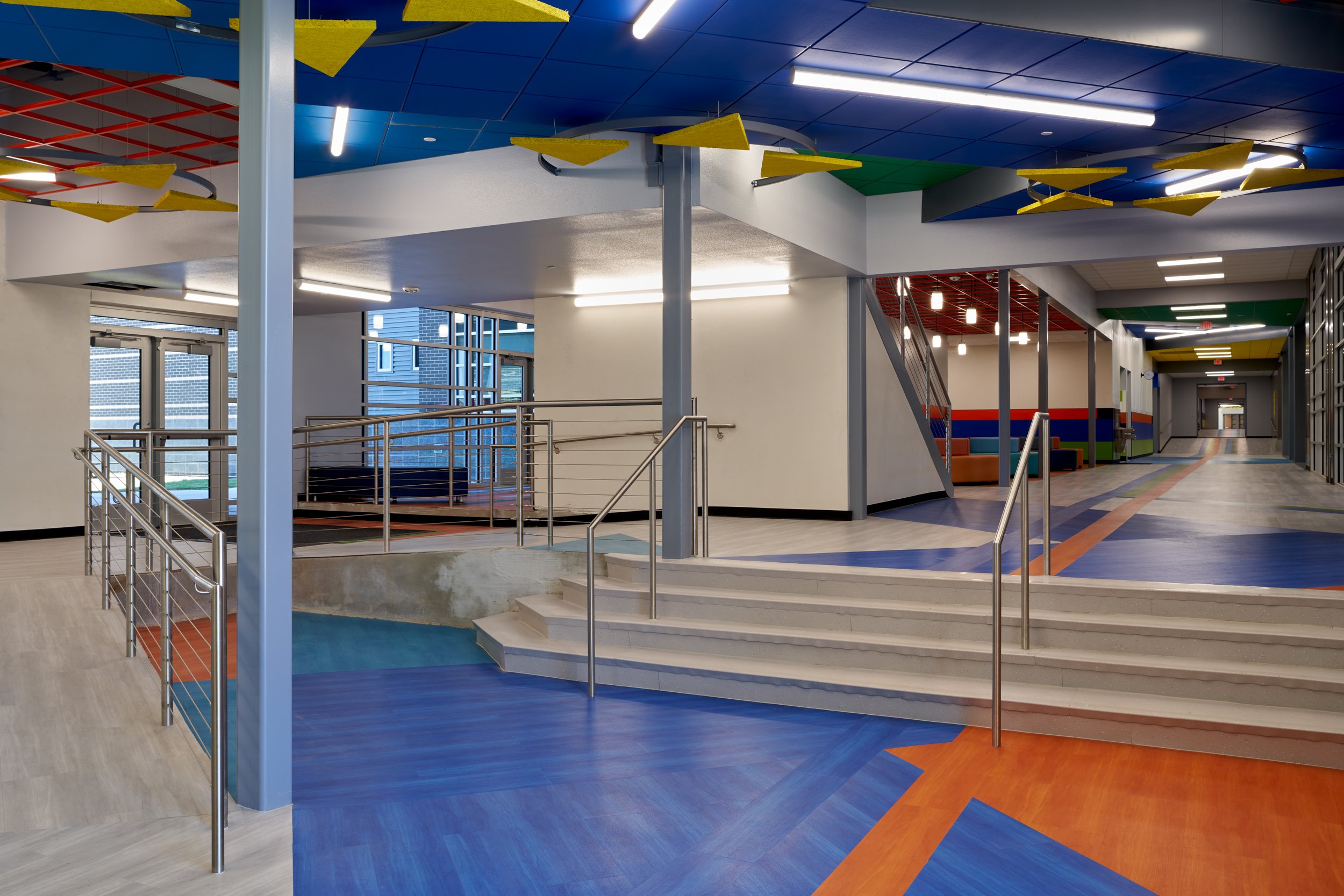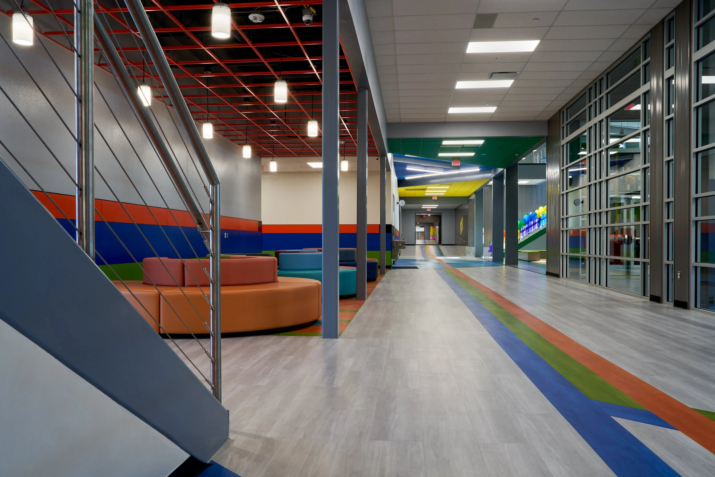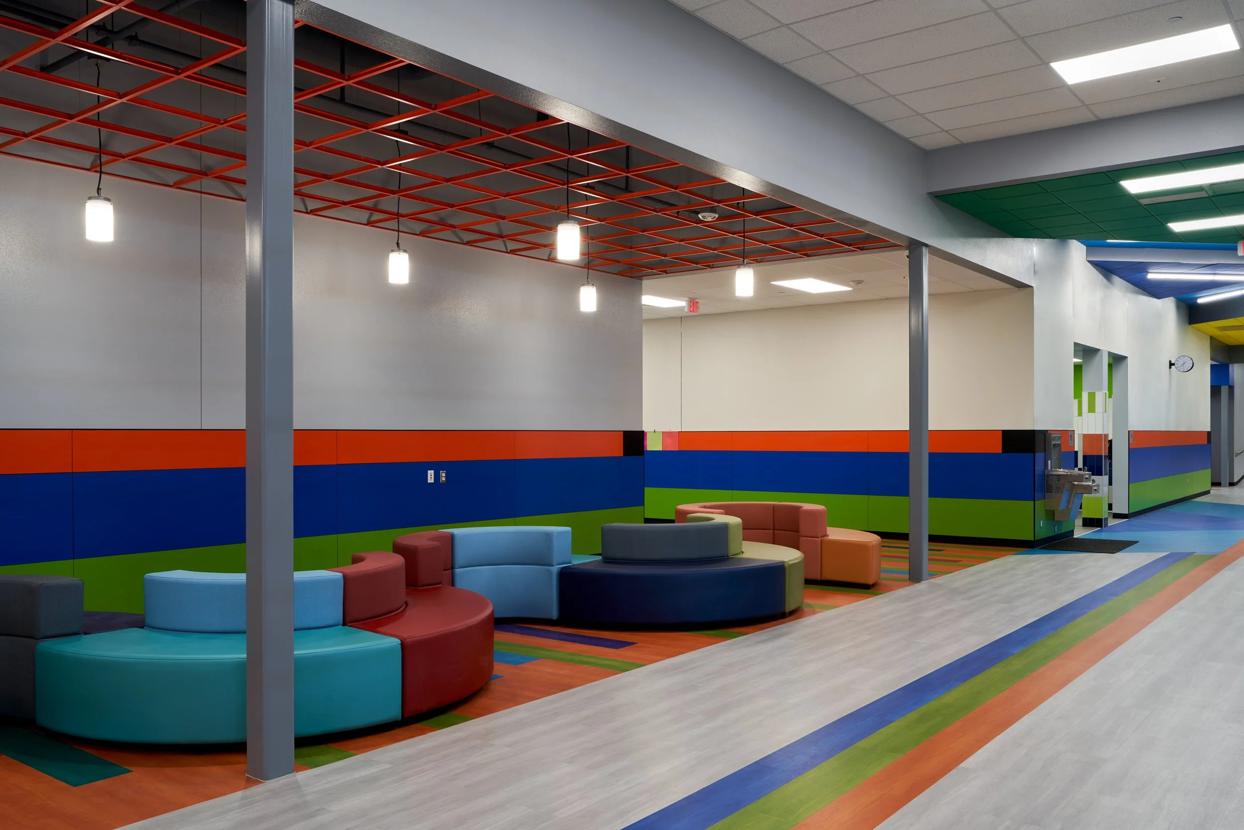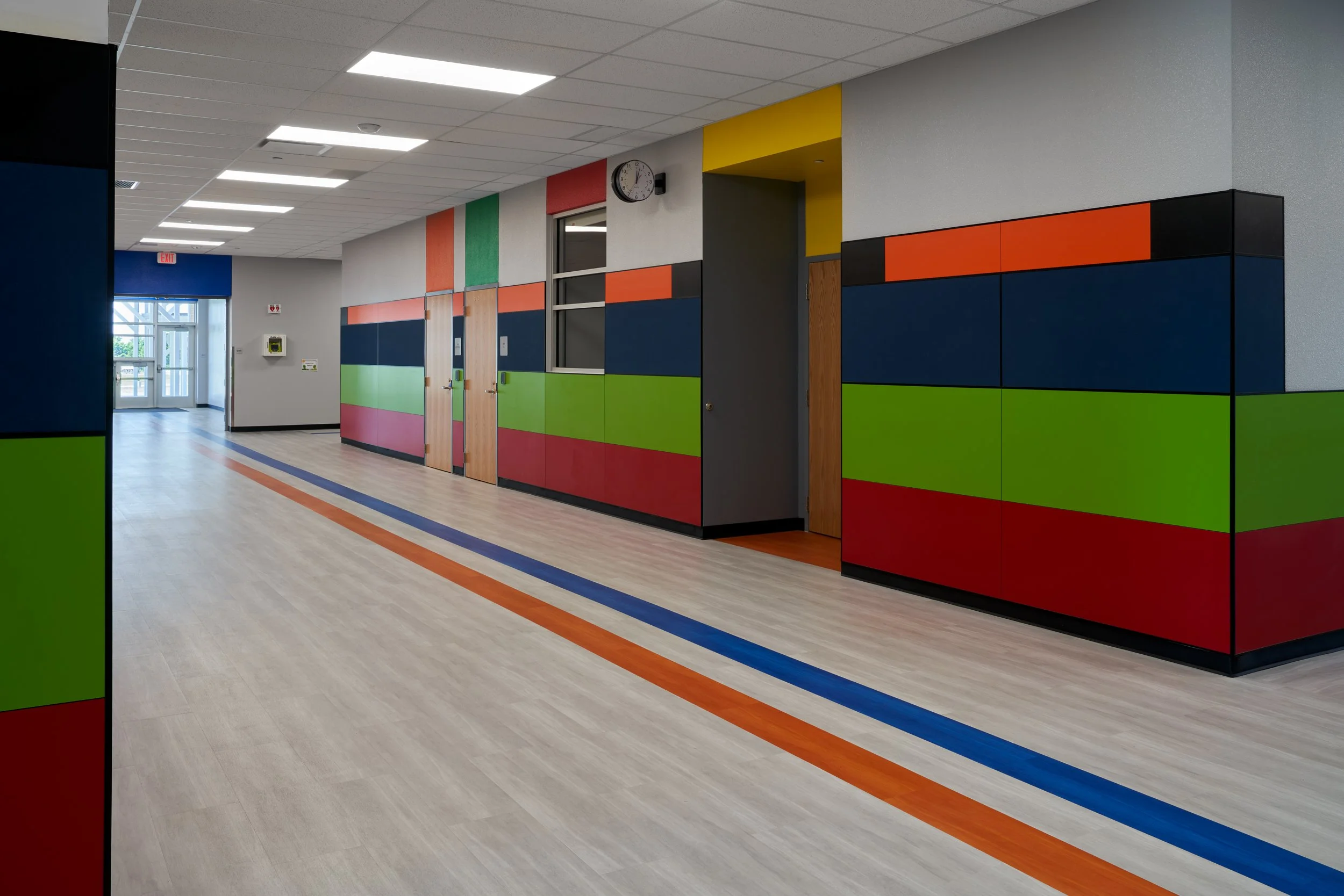 The facility includes general education classrooms supported by specialty spaces for music and physical education, along with a library and dedicated administration area. A full-service cafeteria, gymnasium, and storm shelter were integrated into the building to support daily use while enhancing safety. Indoor and outdoor playgrounds further expand opportunities for student activity and engagement. Together, these elements create a flexible and durable elementary school that supports instructional needs, student wellness, and long-term district use.