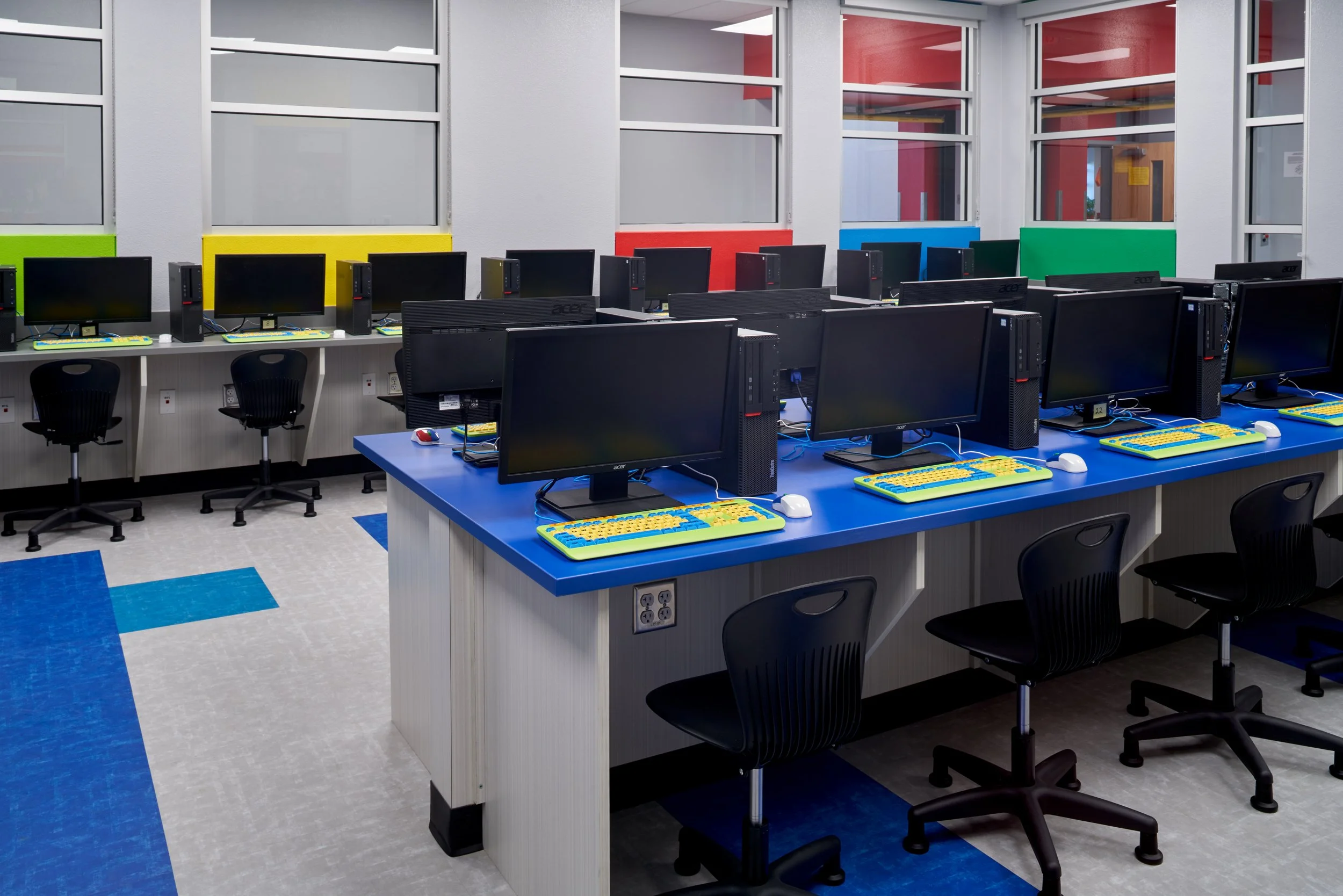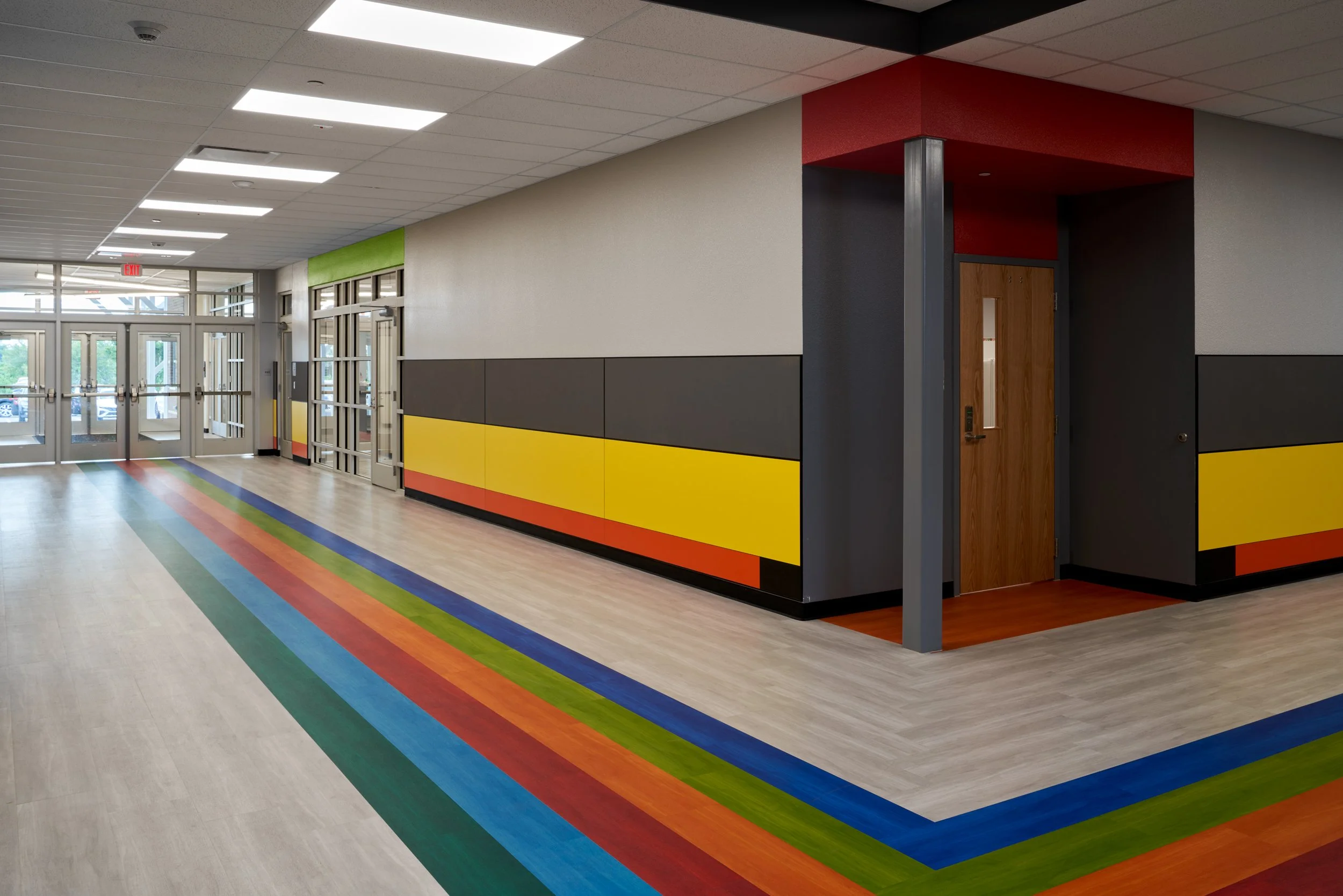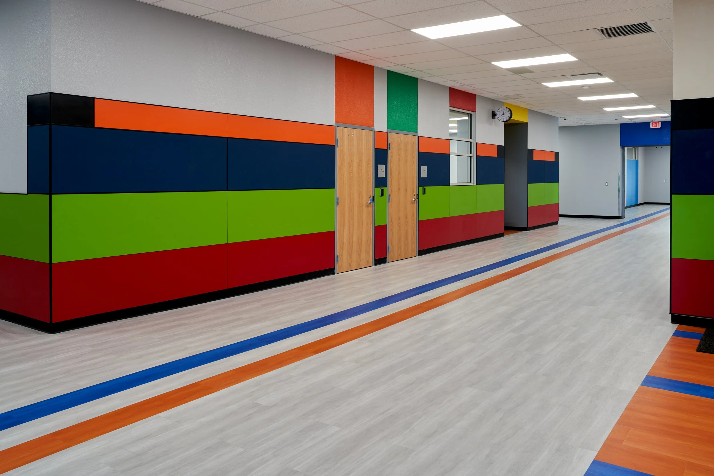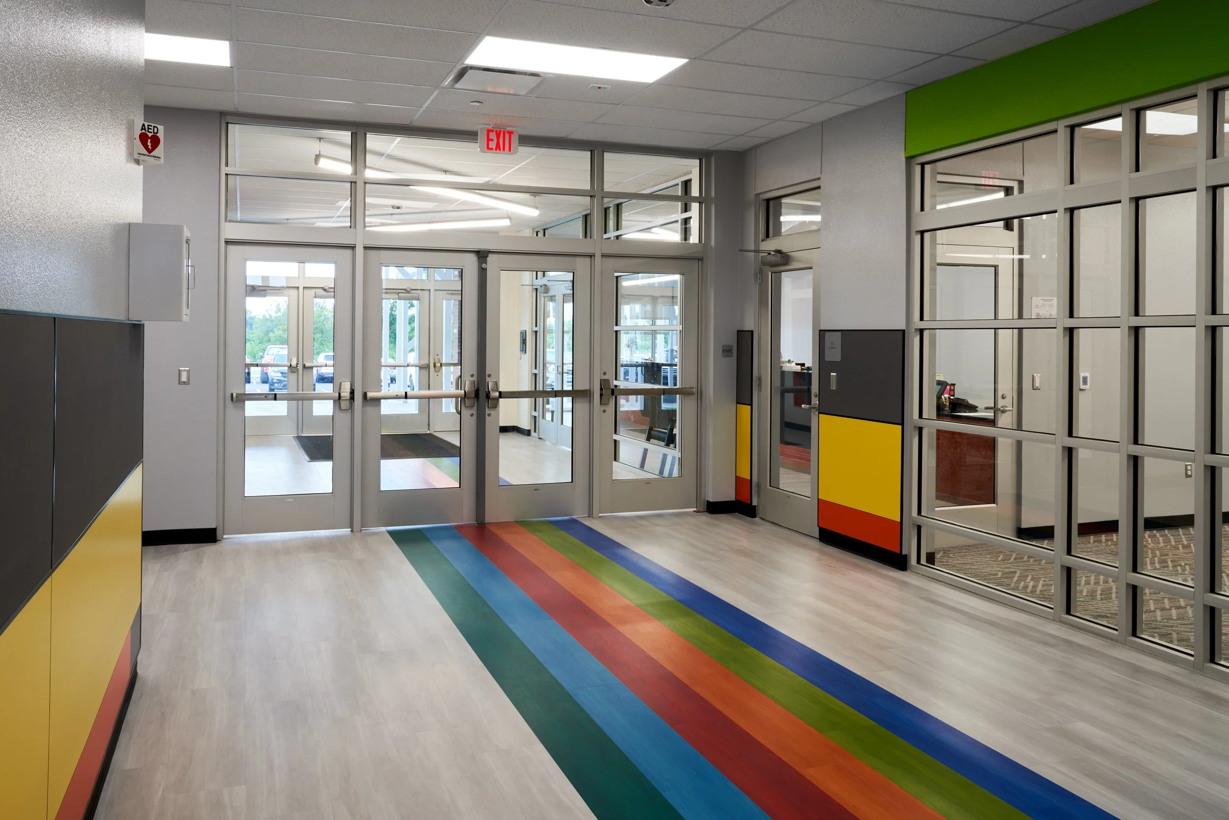 The facility includes general education classrooms supported by specialty spaces for music and physical education, along with a library and dedicated administration area. A full-service cafeteria, gymnasium, and storm shelter were integrated into the building to support daily use while enhancing safety. Indoor and outdoor playgrounds further expand opportunities for student activity and engagement. Together, these elements create a flexible and durable elementary school that supports instructional needs, student wellness, and long-term district use.